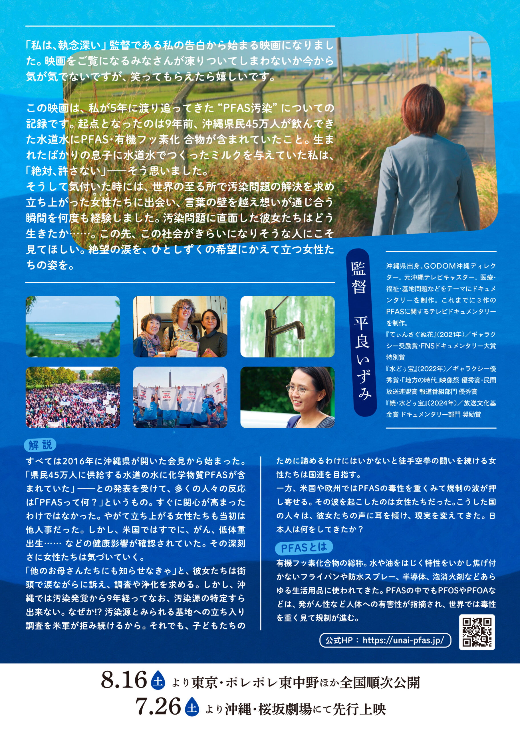 2016年、沖縄の水道水から有害化学物質PFASが検出された。健康被害の深刻さに気づいた女性たちは、子どもたちを守るため調査と浄化を求めて立ち上がる。しかし米軍基地への立ち入りは拒まれ、汚染源はいまも特定できない。世界では女性たちの声が規制を動かす中、日本は何をしてきたのか―。その問いを描くドキュメンタリー。