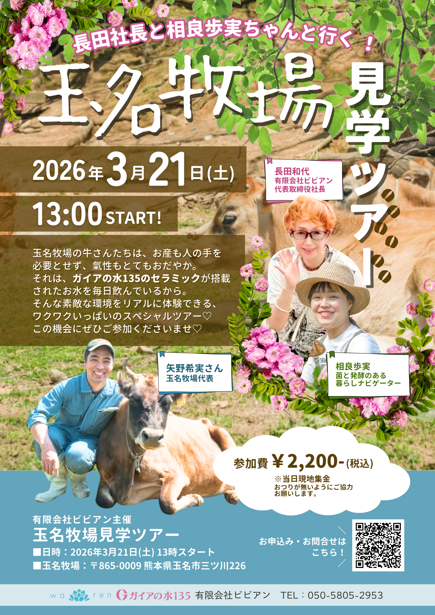 自然豊かで広大な牧場で、毎日ガイアの水135を飲んで育つ動物たちを通して、水の重要性を体感できる見学ツアーです。ガイアの水135の有限会社ビビアン長田社長と、菌と発酵の専門家相良歩実さんと一緒に巡ります。玉名牧場代表の矢野希実(きみのり)社長の食への思い、現在の食品業界の驚きの事実などについても学べます。