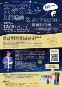 【大阪】「カタカムナってなに?知りたい人のためのカタカムナ入門講座」「ガイアの水135商品説明&社長のお話会」「懇親会(忘年会)」