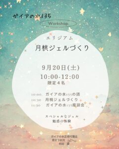 参加費:¥3,000(100mlの完成品ジェル&レシピ付き&500ml分の材料※)定員4名※要予約【9/18(木)17:00まで予約可能】
